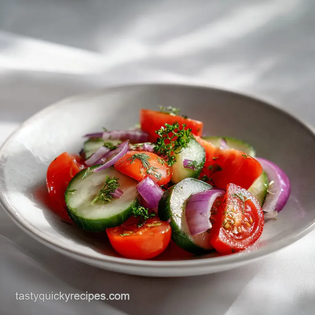 Success Checklist: - ✓ Cucumbers patted completely dry after salting - ✓ Dressing whisked until cohesive and glossy - ✓ Tomatoes quartered cleanly without crushing - ✓ Parsley added as the final step - ✓ Red onions sliced paper thin for balance